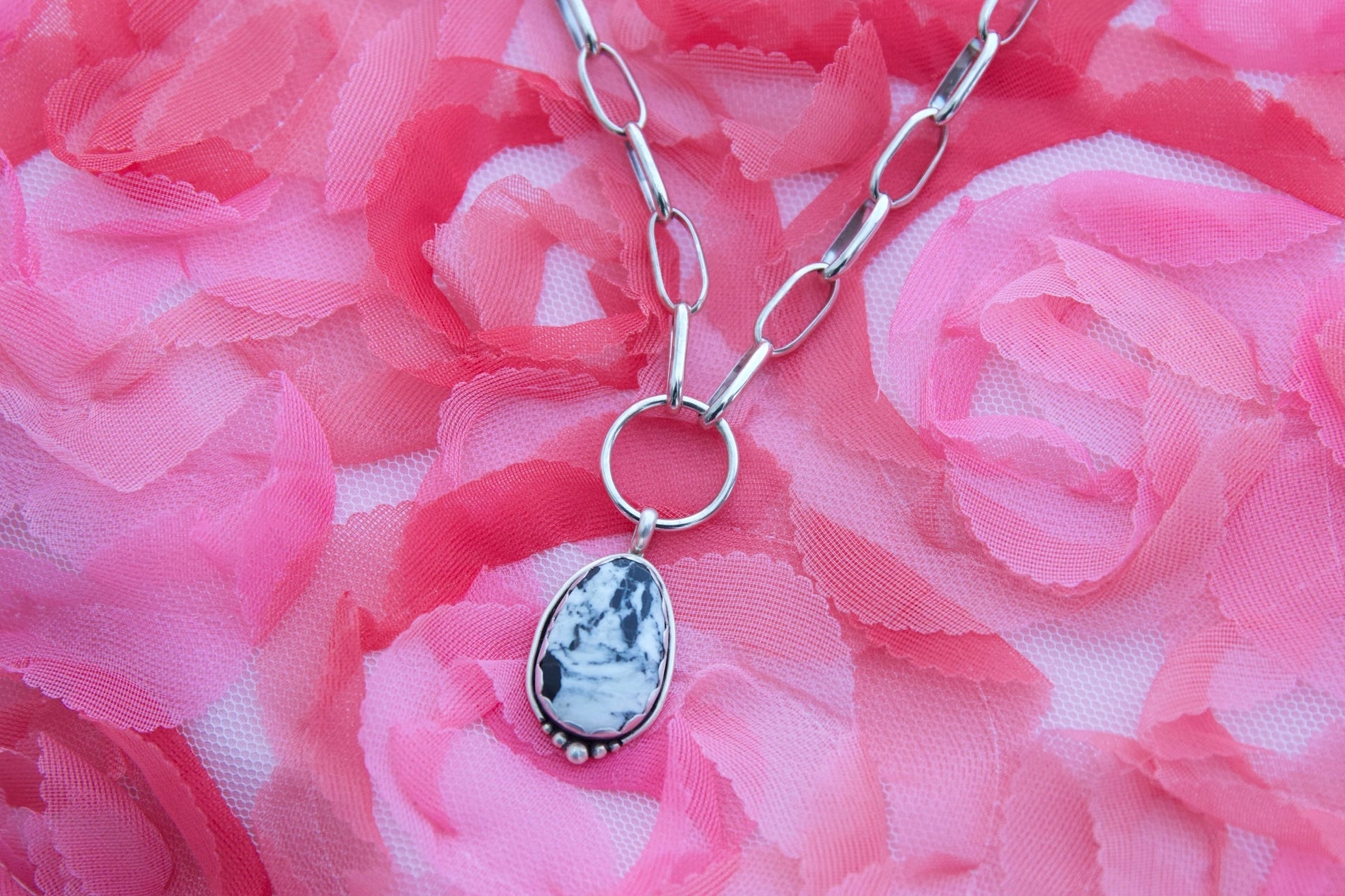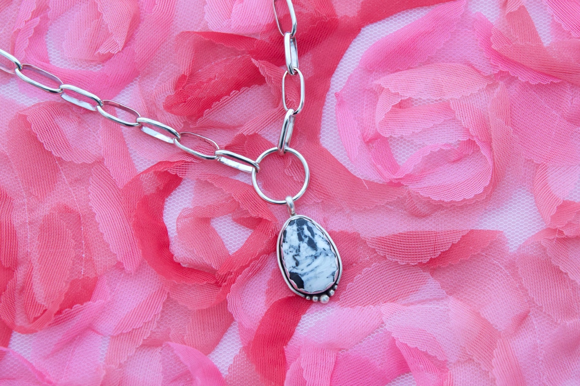 Single stone White Buffalo necklace on a 17” oxidized handmade sterling silver chain