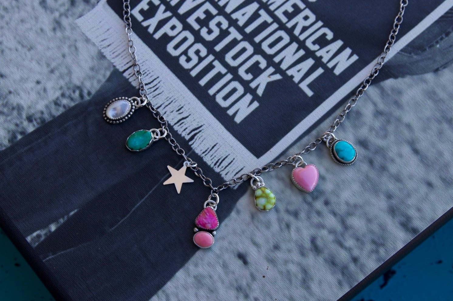 Multi-stone charm necklace with a sterling silver charm on an oxidized sterling silver chain