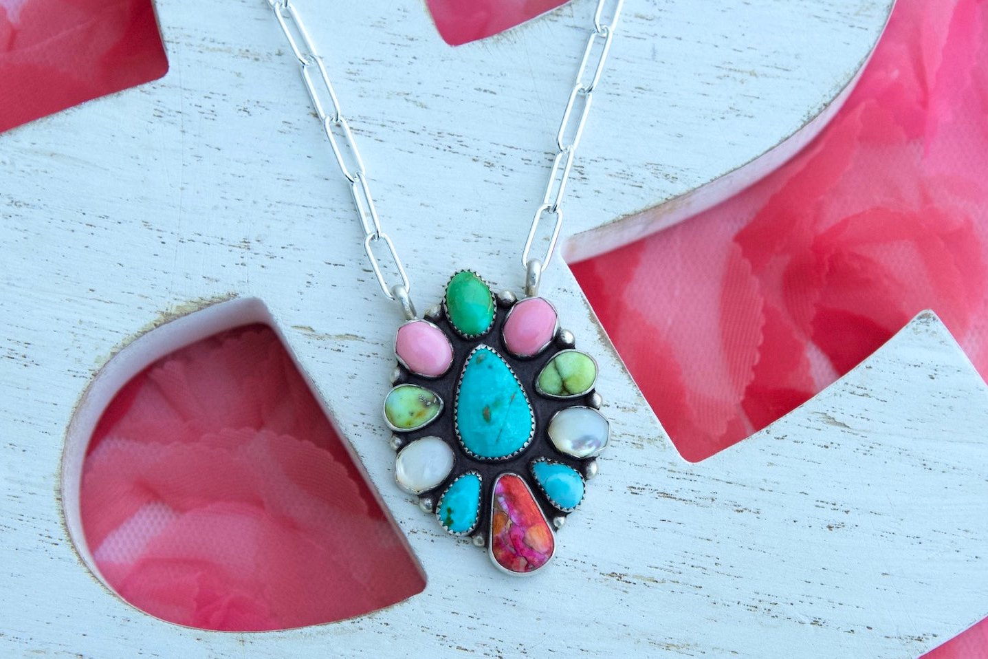 Multi stone cluster necklace on a 18” sterling silver chain