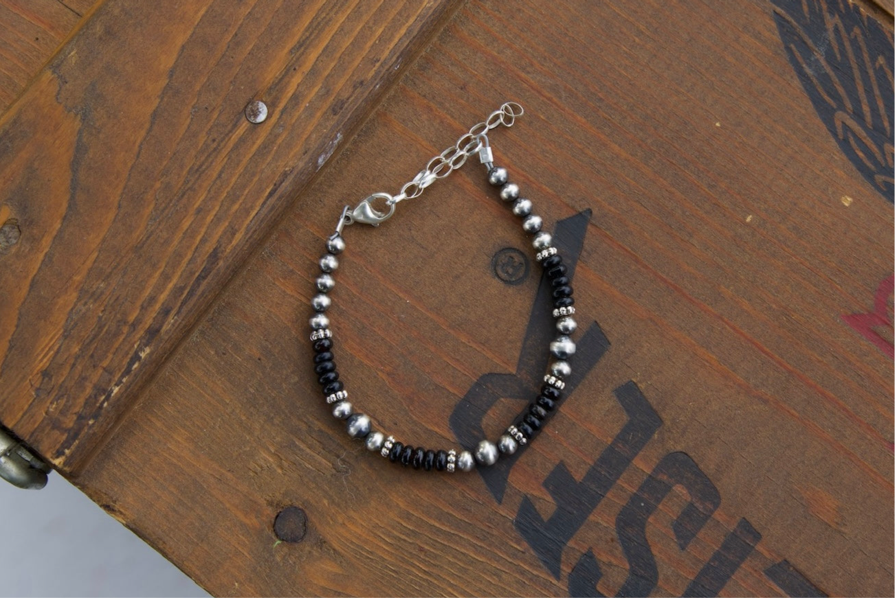 Black onyx and sterling silver pearl bracelet