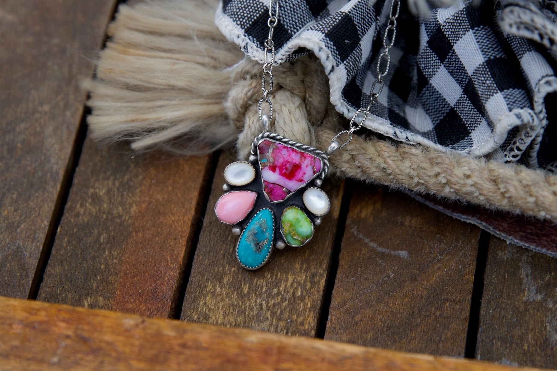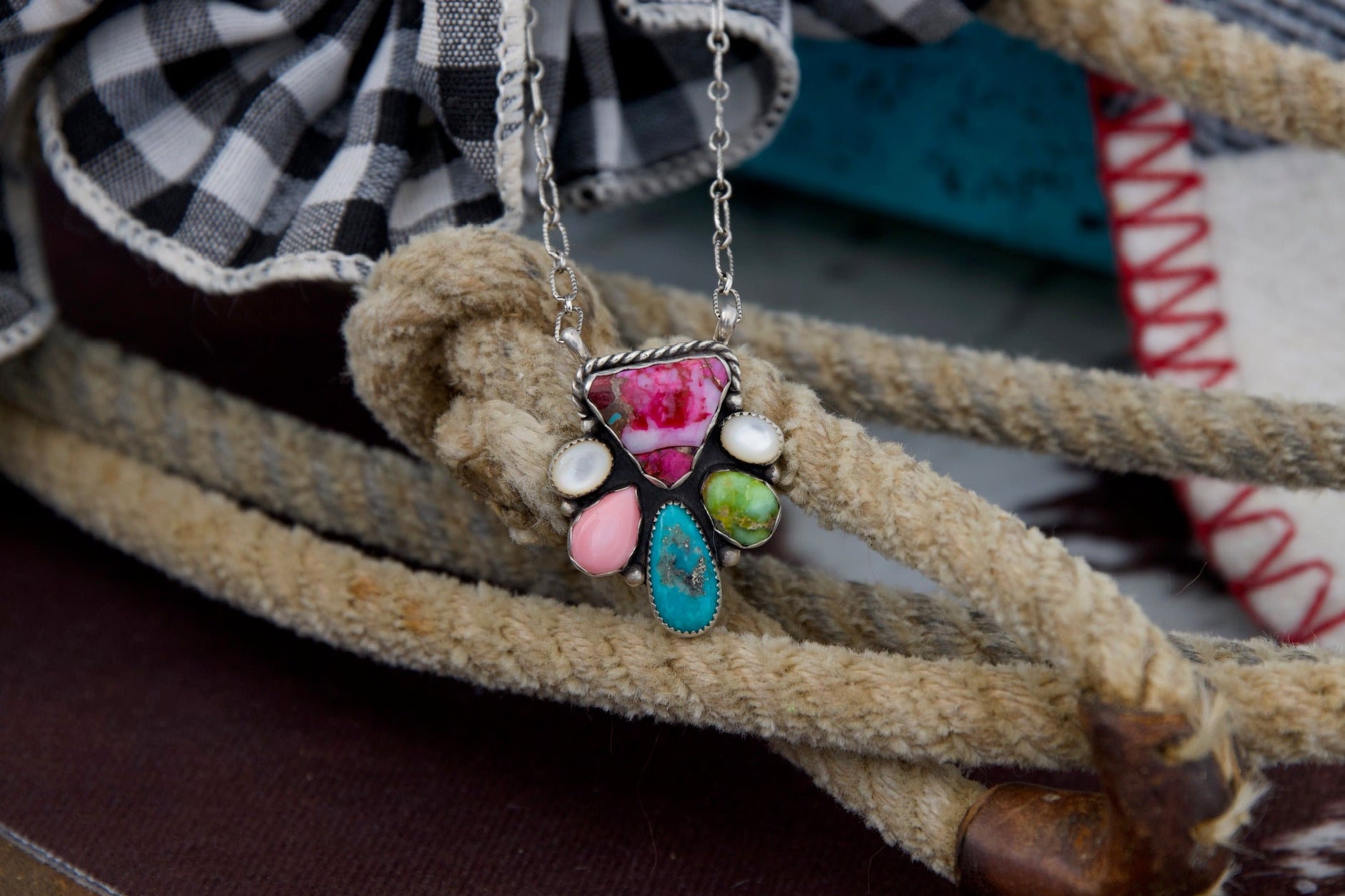 Pink spiny, palomino, royston, pink conch, and mother of pearl necklace