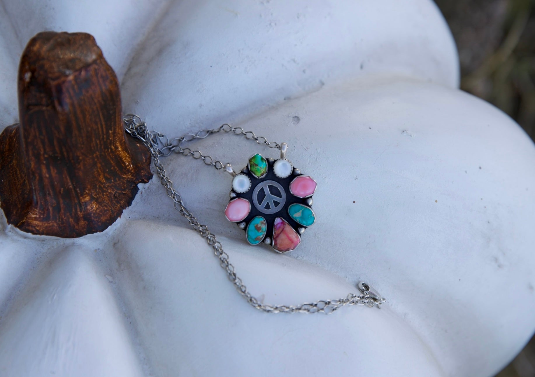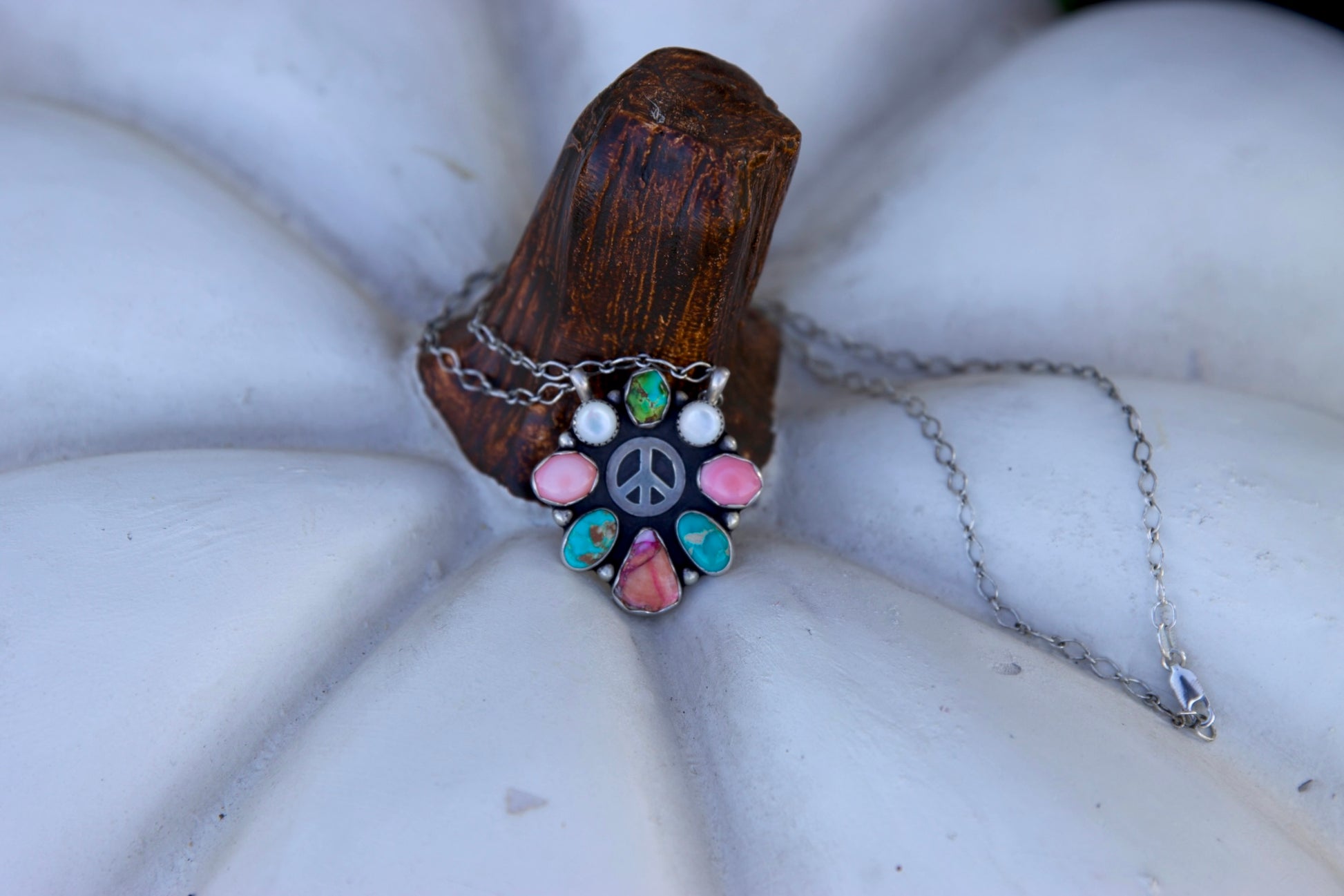 Multi stone cluster necklace centered around a peace sign